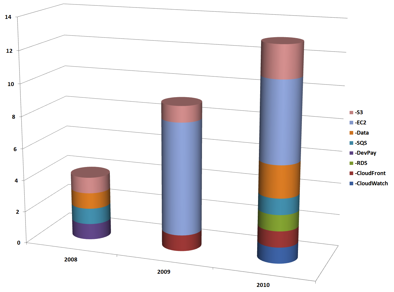 Perhaps most importantly, in 2010, every single service had significant feature updates and releases. This, I think, is the crux of one of Amazon’s key competitive advantages. A fast-firing multi-service release cycle that allows them to continue to plow ahead of others in the market place.